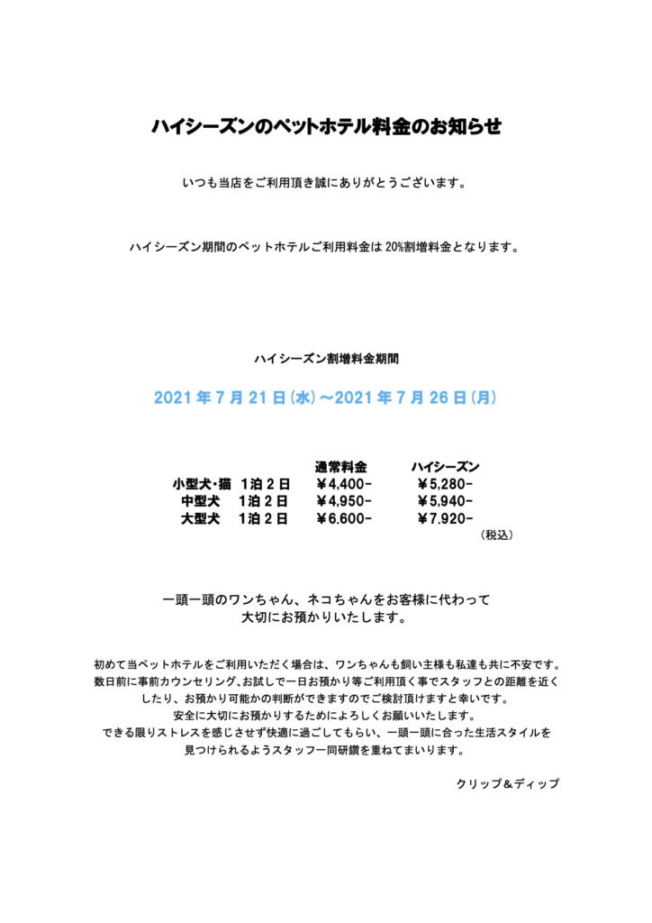 7月21日(水)〜7月26日(月)までの期間はハイシーズン期間になりペットホテル料金が20%割増料金となります。