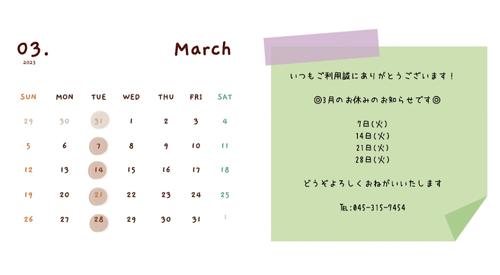 📢今月のお休みのお知らせです📢