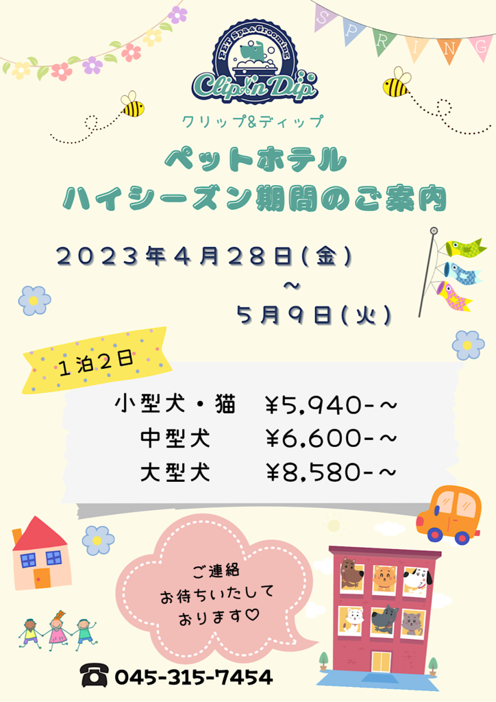 2023年4月28日(金)〜2023年5月9日(火)までの期間はゴールデンウィークのハイシーズン期間になりペットホテル料金が20%割増料金となります。
