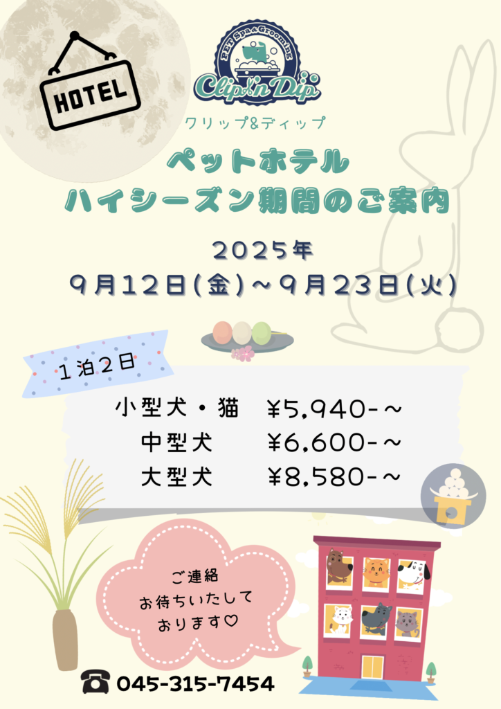2025年9月12日(金)〜2025年9月23日(火)までの期間はハイシーズン期間となりペットホテル料金が20%割増となります。